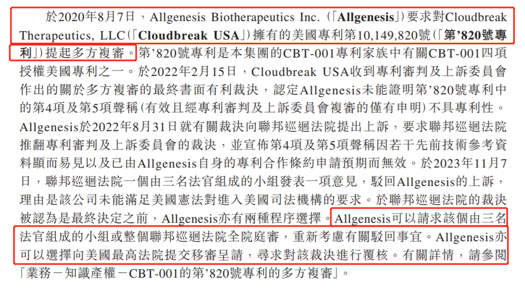 2020年8月7日,Allgenesis要求对拨康视云拥有的美国专利第10149820号提起多方复审,该专利是CBT-001专利家族中有关CBT-001的四项授权美国专利之一。