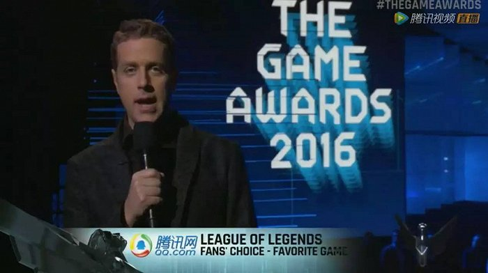 (2016 年 TGA 上,主持人口播了《英雄联盟》获得「粉丝选择奖」的消息)