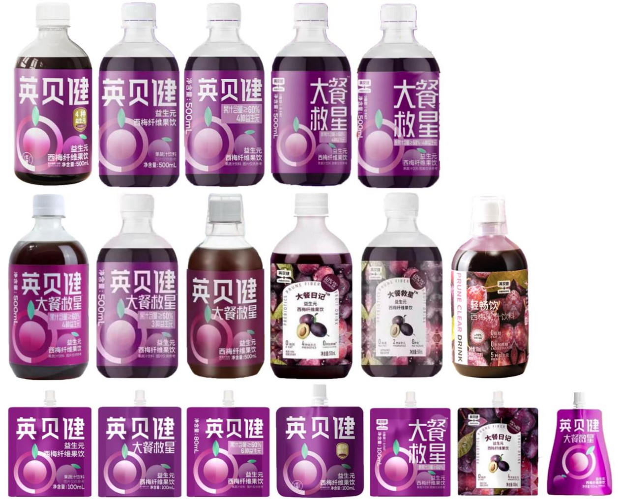 通过商标注册情况可以清晰的看到,曾经出现在英贝健西梅汁上的“大餐救星”、“一健轻畅”、“大餐日记”、“轻畅饮”等商标已均处于失效状态,现阶段还在销售的产品使用的“大餐自由水”、“大餐伴侣”等也面临驳回复审的问题。