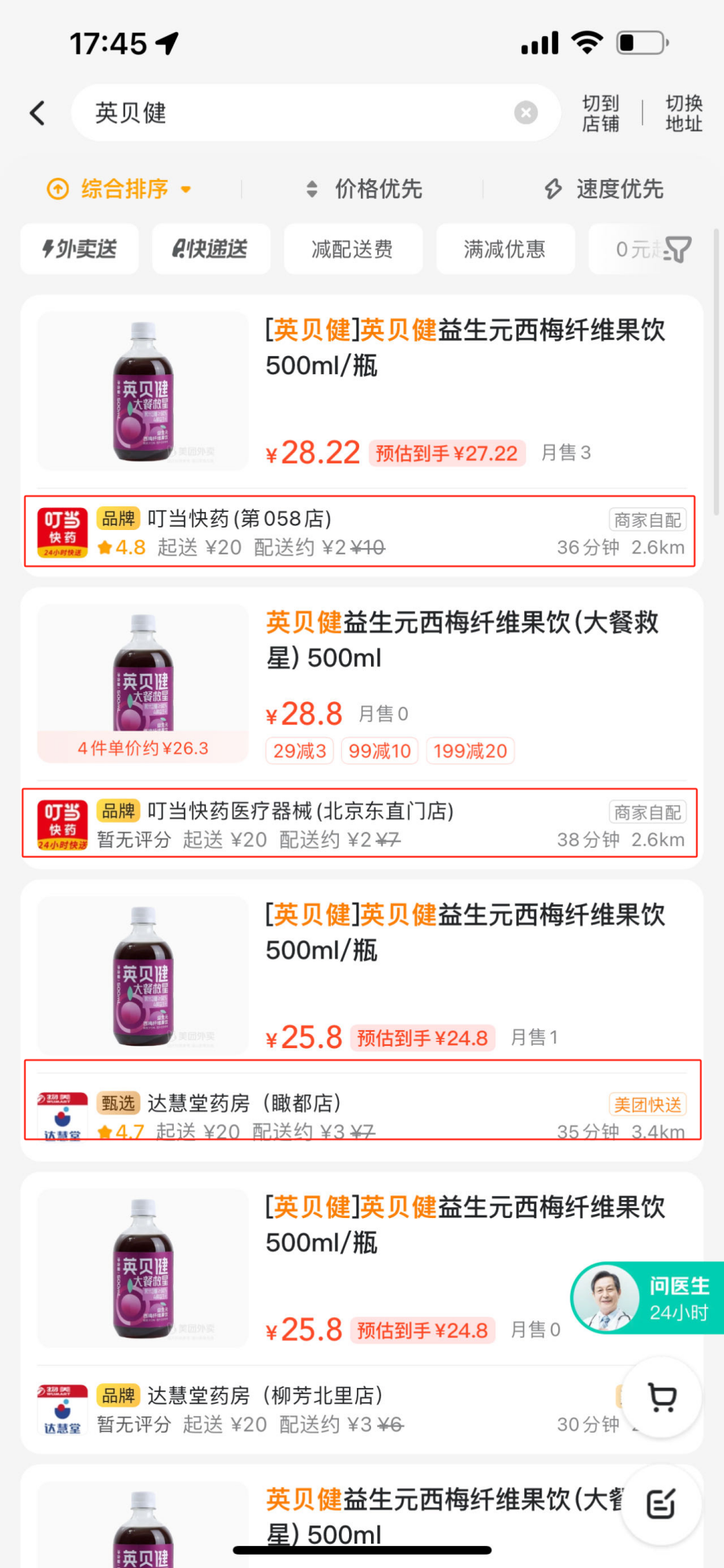 对销售渠道的精耕也存在于英贝健产品在O2O、到家服务类APP的销售中,在北京某地址,通过美团外卖APP搜索“英贝健”、“英贝健西梅汁”等关键词,跳出与产品相关的大量销售店铺为药店。依据国家相关法律法规,药店在具备食品经营许可证的前提下,也可以售卖一般食品。