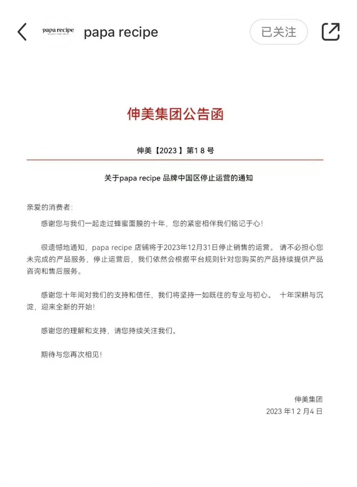 12月4日,papa recipe春雨的中国运营方伸美集团发布一则“关于papa recipe品牌中国区停止运营”的公告。公告称,春雨线上店铺将于2023年12月31日停止运营。