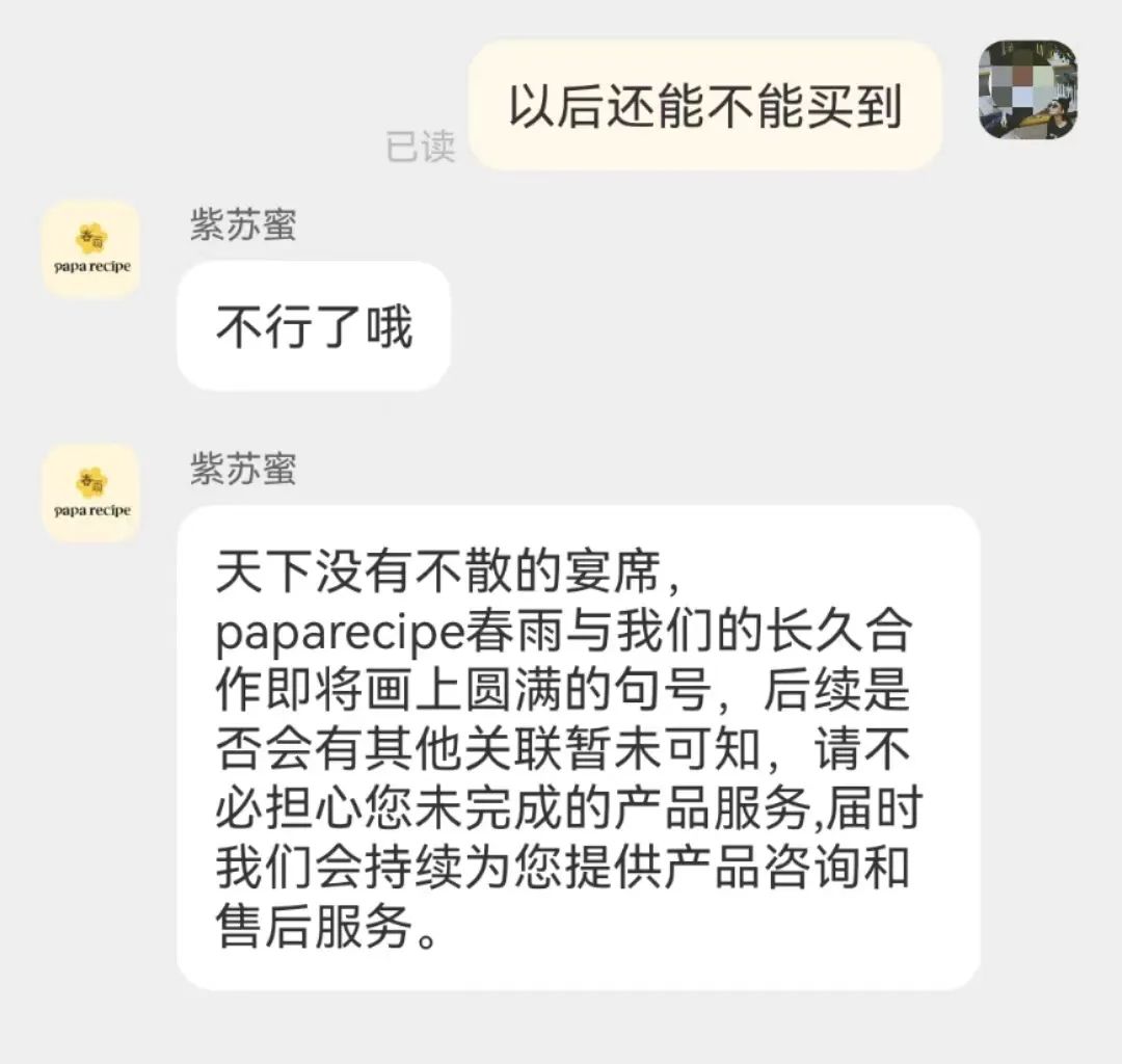 针对伸美集团此次发布的闭店公告,C2CC传媒X新妆就此咨询其天猫旗舰店客服,回应称“天下没有不散的宴席,paparecipe春雨与我们的长久合作即将画上圆满的句号,后续是否会有其他关联暂未可知,请不必担心您未完成的产品服务,届时我们会持续为您提供产品咨询和售后服务。”