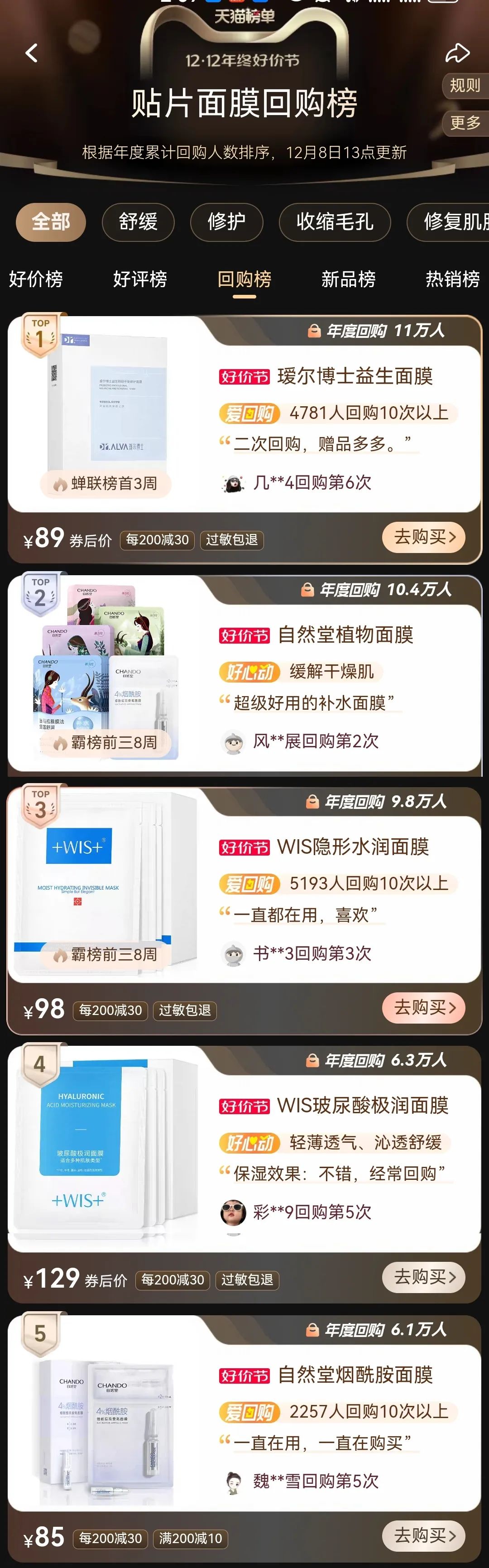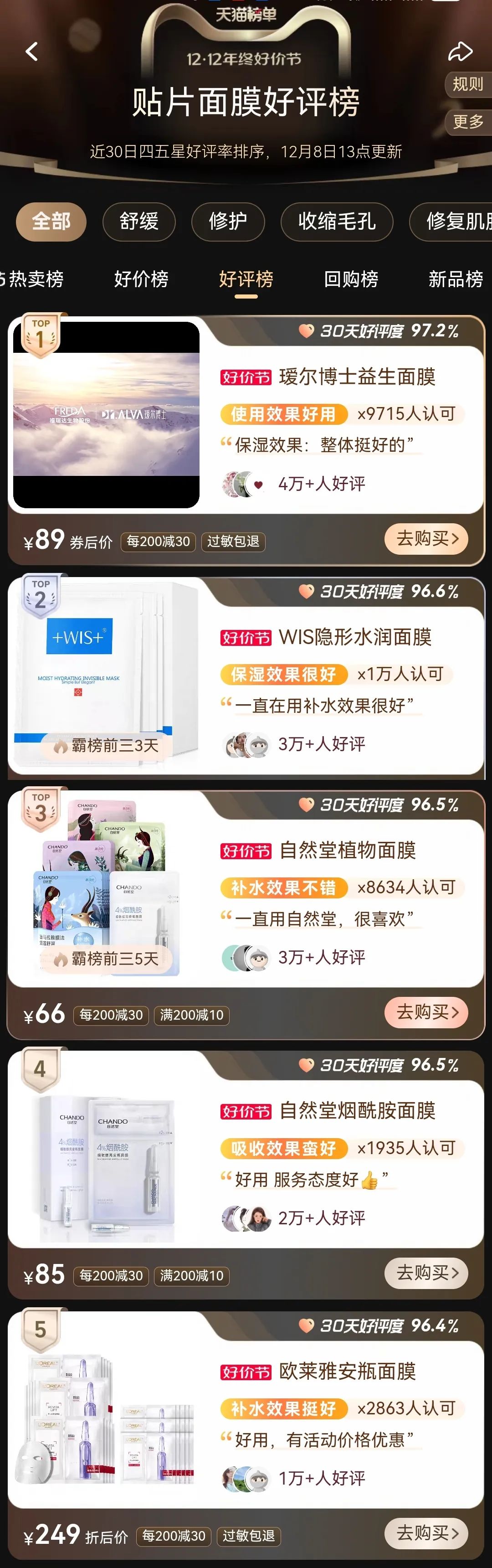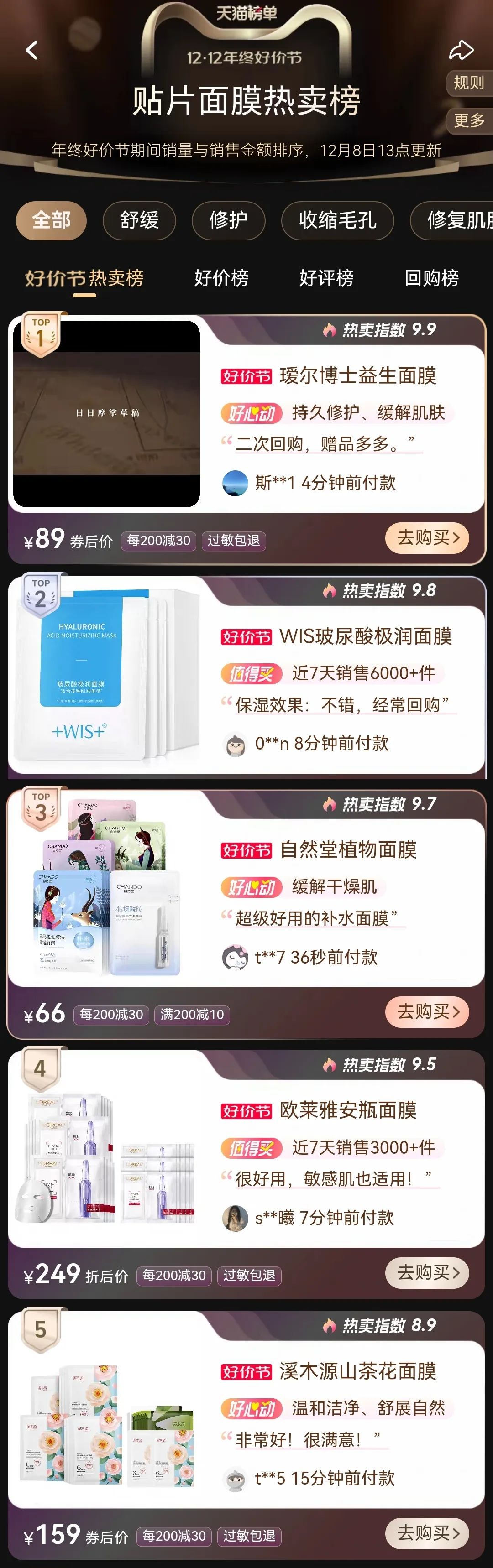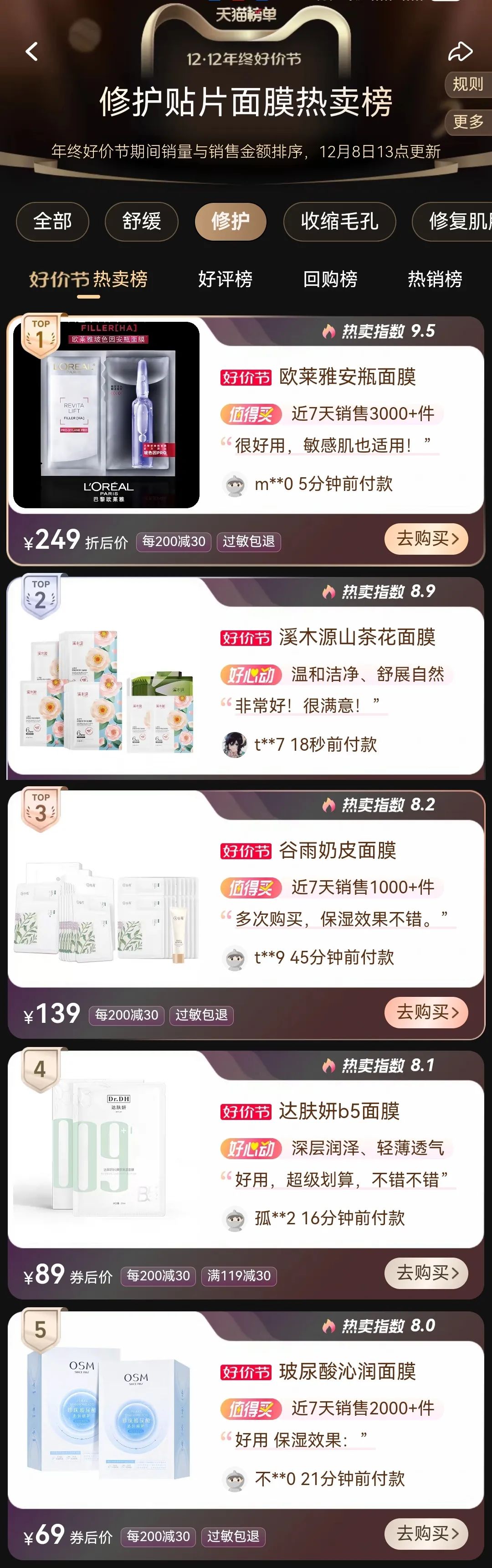 其中,瑷尔博士益生菌面膜2.0已售90万+,登榜天猫贴片面膜热卖榜第1名;自然堂喜马拉雅补水面膜已售100万+;珀莱雅双抗精华面膜2.0已售100万+,问鼎天猫超市修护面膜回购榜,并霸榜TOP385天。
