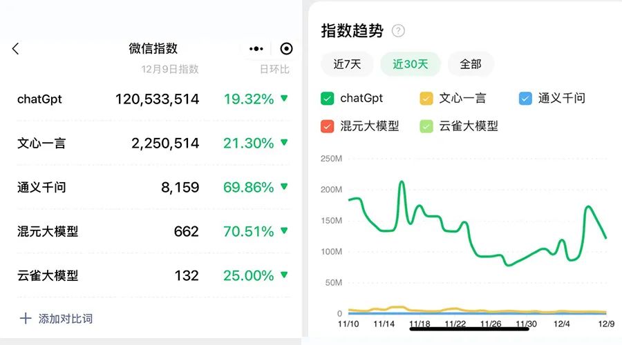 从微信指数的数据,可以管中窥豹到各家大模型的感知度,ChatGPT 遥遥领先,依然是国内大模型们追赶的对象。