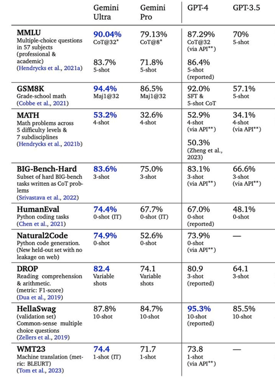 而根据谷歌自己发布的数据对比图,Gemini Ultra 仅以微弱优势领先于 OpenAI 的 GPT-4 模型,换句话说,谷歌最新的 AI 模型,水平仅仅比 OpenAI 一年前的基础高一点而已,并非有巨大的优势,况且目前真正代表 OpenAI 实力的,是下一代的 GPT-4.5或 GPT-5。