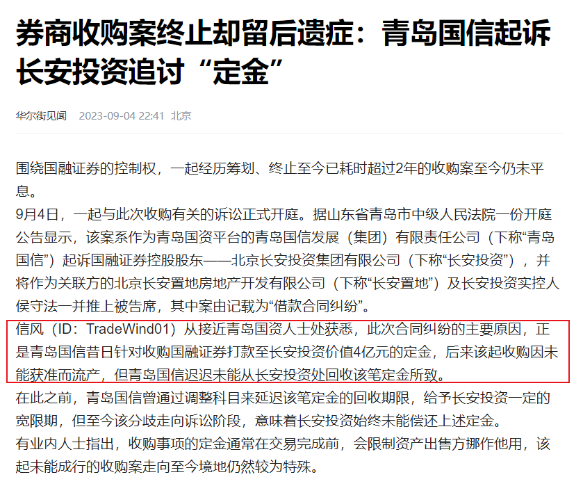 新媒体“信风”从接近青岛国资人士核实,此次借款合同纠纷的主要原因,正是青岛国信昔日针对收购国融证券打款至长安投资价值4亿元的定金,后来该起收购因未能获准而流产,但青岛国信迟迟未能从长安投资处回收该笔定金所致,如今这起收购走向诉讼阶段,意味着长安投资始终未能偿还上述定金。