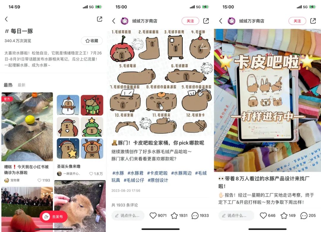 在这些动物IP被抽象成“精神稳定”“躺平”的象征后,人们对他们的爱已经不再局限于视频、图文等二创形式了,相关的付费意愿与日俱增,以“卡皮巴拉”为代表的周边生意乘风而起。截至目前,小红书上“水豚周边”的话题浏览量已直逼1000万。