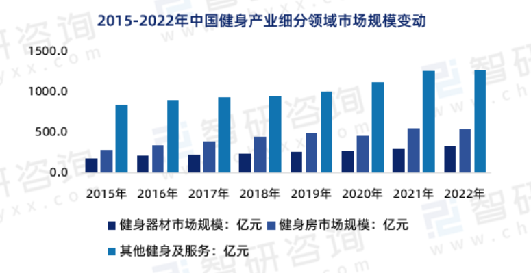 由于民众对健康理念的追求、媒体市场的宣传与助力以及大型体育赛事的氛围烘托,我国体育产业进入高速增长期。数据显示,我国健身行业规模从2015年的1300亿元增长至2022年2144.5亿元,其中健身房市场规模541.3亿元,健身器材市场规模约334.1亿元,健身爱好者数量达7.1亿人。