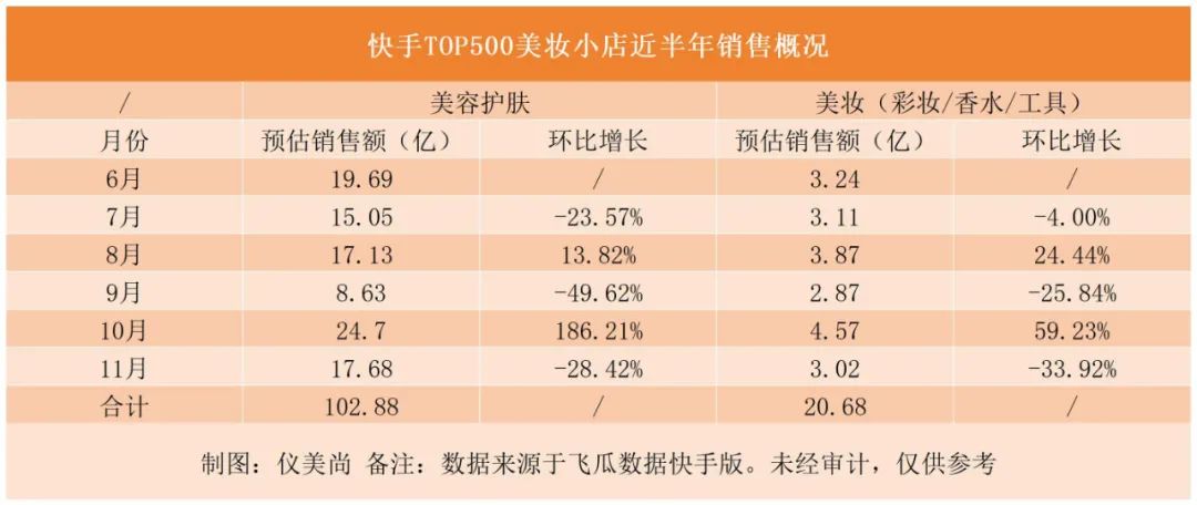 飞瓜数据快手版显示,今年10月,快手美容护肤和美妆TOP500小店的预估总GMV为29.27亿元。而抖音,仅预估GMV最高过亿元的品牌就高达46个。