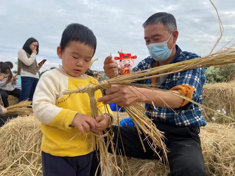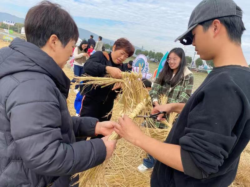 大学生的创意,也吸引来了不少村民参与。“要让‘稻草人’立起来,打结也很关键!”村民王大娘也带着孙子一起参与到了有趣的“稻田艺术”活动中,还给同学们示范起了稻草打结的方法。“第一次看到稻草可以做出这么精美的艺术品!”家住市区的刘女士从小红书看到了这些新奇的稻草艺术品,带着家人专程驱车而来参与活动。