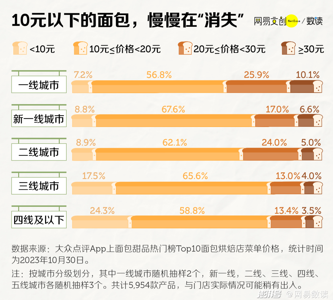 微博中一项针对34万人的投票调查显示,69%的网友对面包的价格预期在10元以内;仅有23%能接受10~20元的价格。[7]然而,根据网易数读对大众点评app上商家数据的分析,便宜的面包越来越少了。