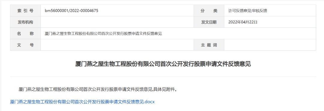 然而在 2022 年 4 月,证监会发布《厦门燕之屋生物工程股份有限公司首次公开发行股票申请文件反馈意见》,对燕之屋首次公开发行股票申请文件发布反馈意见,全文字数逼近 2 万字,包含要求说明规范性问题、信息披露问题等共计 57 个问题。其中不乏“食品安全”“虚假宣传”“对赌协议”等“犀利问题”。