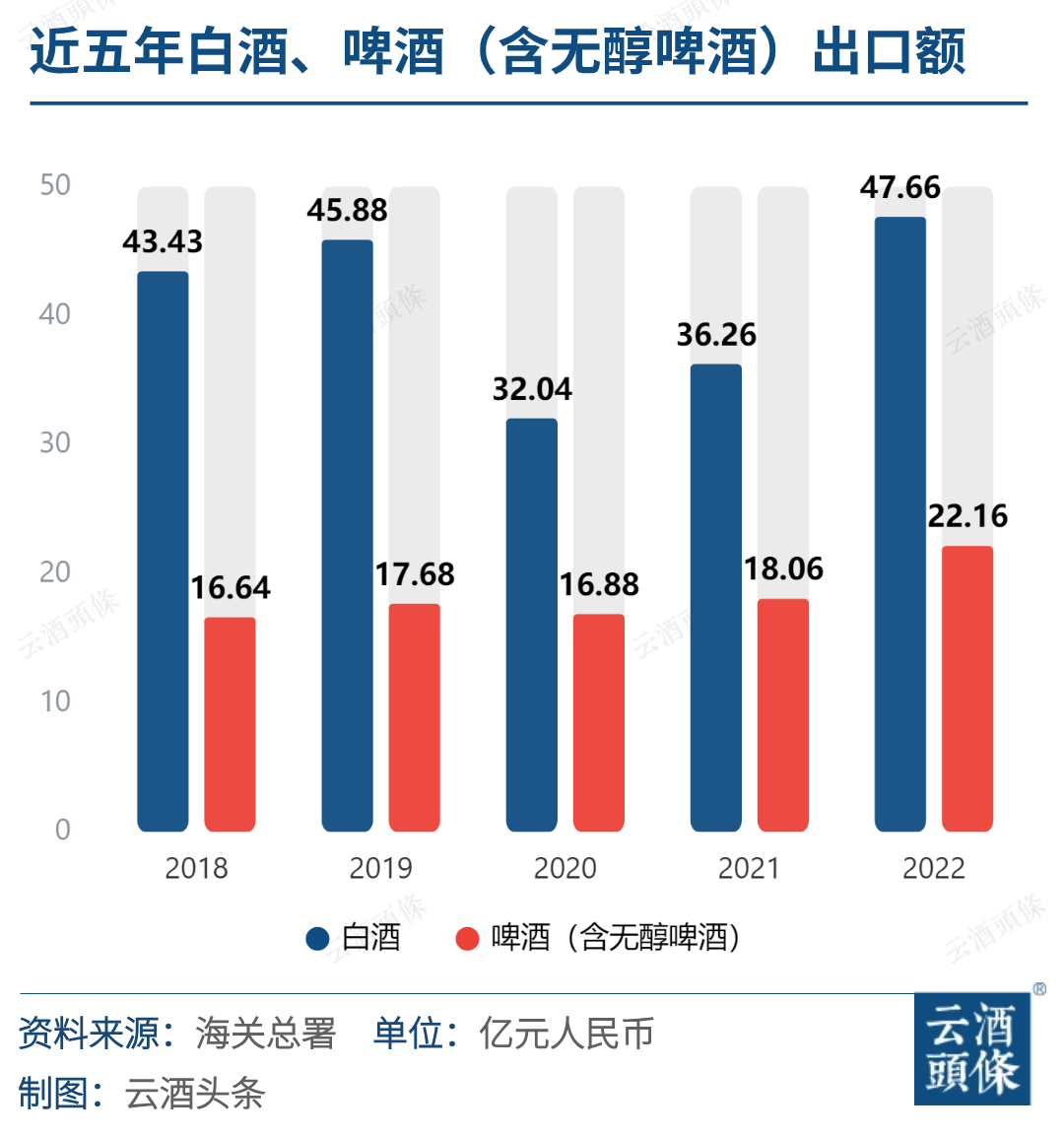 海关数据显示,2022年,全国白酒出口量1.64万千升,同比微增2.37%;出口额47.66亿元,同比增长31.43%。啤酒出口量48.18万千升,同比增长13.26%;出口额22.16亿元,同比增长22.7%。出口黄酒量1.18万千升,同比增长6.92%;出口额1.51亿元,同比增加18.31%。