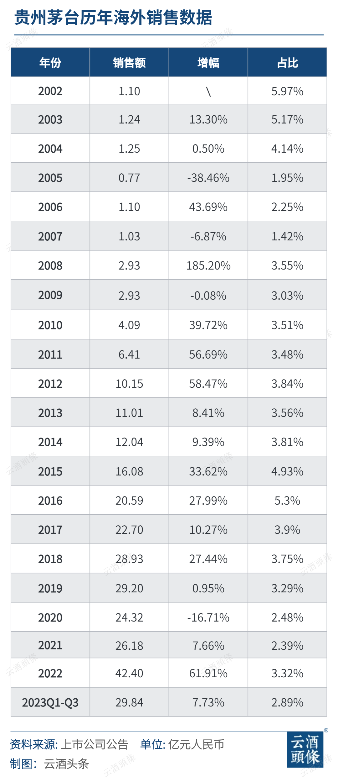 今年前三季度,贵州茅台在海外市场依然保持7.73%增速,实现销售额近30亿元。以贵州茅台为代表的龙头企业,将在很长一段时间内继续领跑酒类出口大盘。