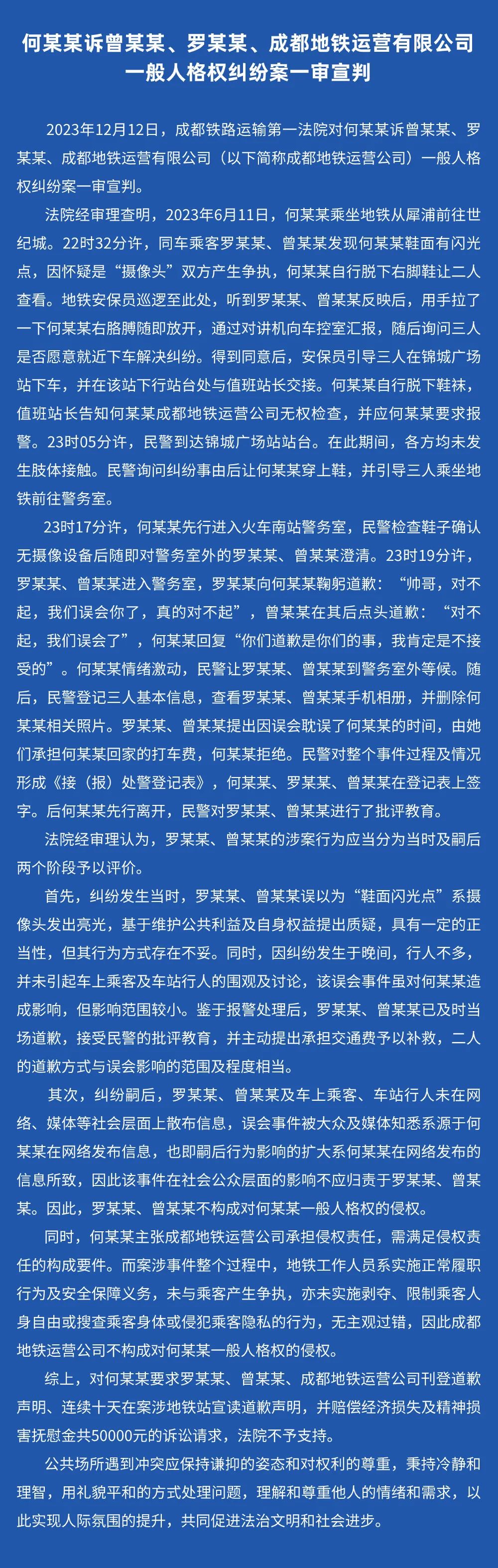 成铁第一法院官微消息,12月12日,成都铁路运输第一法院对何某某诉曾某某、罗某某、成都地铁运营有限公司一般人格权纠纷案一审宣判。法院经审理认为,罗某某、曾某某的涉案行为应当分为当时及嗣后两个阶段予以评价。对何某某要求罗某某、曾某某、成都地铁运营公司刊登道歉声明、连续十天在案涉地铁站宣读道歉声明,并赔偿经济损失及精神损害抚慰金共50000元的诉讼请求,法院不予支持。
