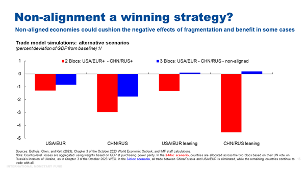 还有明显迹象表明,全球外国直接投资(FDI)正在按照地缘政治路线进行分割。俄乌冲突爆发后,集团间公布的FDI项目下降幅度超过集团内部项目,而对不结盟国家的FDI则大幅增加。事实上,2023年第三季度宣布的FDI项目中近40%位于这些经济体。