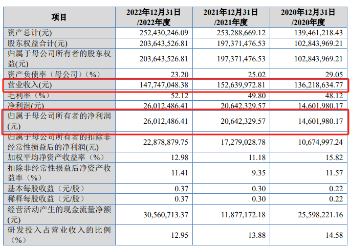 「子弹财经」还发现,兆信股份在营收规模没有扩大的背景下,公司归母净利润却在大幅增长。数据显示,2020年至2022年(以下简称“报告期内”),兆信股份营收分别为1.36亿元、1.53亿元、1.48亿元,近几年公司营收几乎停滞增长。