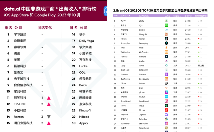 据OneSight发布的《BrandOS TOP 30应用类(非游戏)出海品牌社媒影响力榜单》显示,2023年Q3,WeTV、iQIYI 、Bilibili、MangoTV 分别拿下榜单前四位,而Youku只挤到了TOP10。另一边,在data.ai 《2023年10月中国非游戏厂商出海收入排行榜》上,爱奇艺和腾讯视频分别拿下TOP4、TOP7。