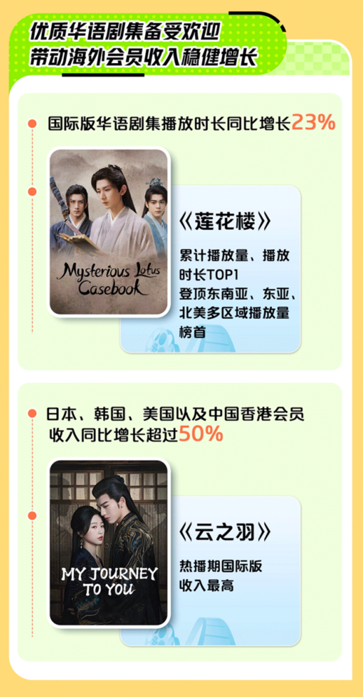 爱奇艺在Q3季度财报中透露,爱奇艺国际版华语剧集播放时长同比增长23%,环比增长33%。《莲花楼》在三季度的累计播放量、播放时长均居爱奇艺国际版第一,同时登顶东南亚、东亚及北美多区域市场播放量榜首。