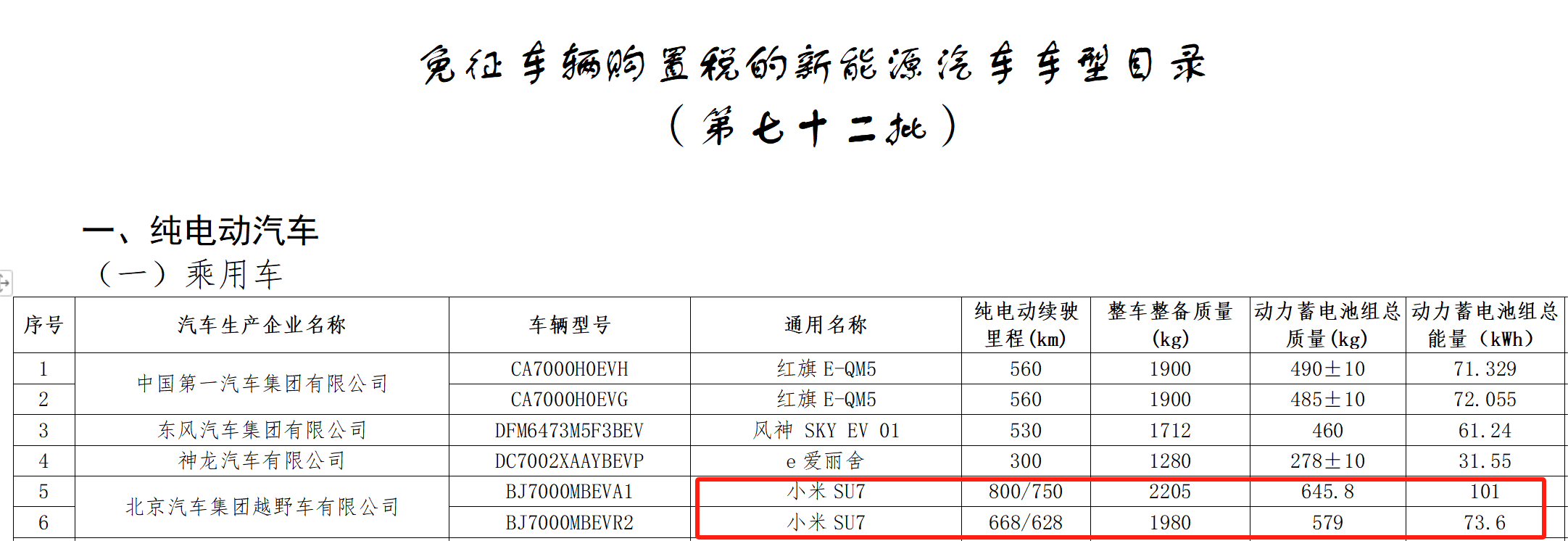 继前不久亮相工信部名录后,小米SU7产品配置信息又出现在工信部12月12日发布的《免征车辆购置税的新能源汽车车型目录(第七十二批)》中。