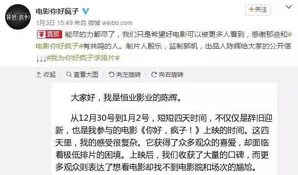1月3日下午,电影《你好,疯子!》的制片人殷乐、监制郭帆、出品人陈辉通过官方微博发表了三封公开信,呼吁院线给电影排片。出品人陈辉在信中写道:“它(电影)获得了众多观众的喜爱,却面临这极低排片的困境”,希望“院线大佬排片线经理们给到5%的空间,能每天排映一个黄金场”。监制郭帆和制片人殷乐也在微博上发布公开信感慨拍片不易,希望院线多给排片,演员王子文随后也转发了微博表示支持。