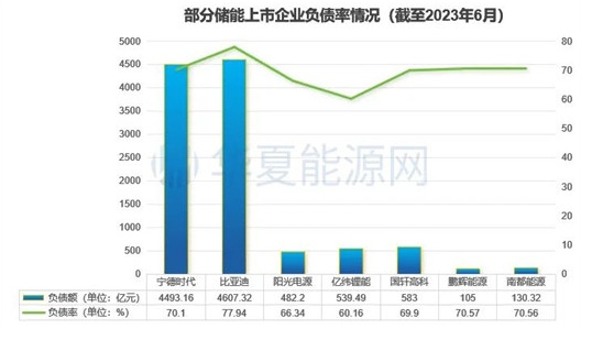 华夏能源网注意到,在不切实际的疯狂扩充下,高负债已成储能行业常态,行业龙头也不例外。数据显示,截至今年6月底,比亚迪(SZ:002594)、鹏辉能源、南都电源(SZ:300068)、宁德时代(SZ:300750)的负债率均超过了70%;国轩高科(SZ:002074)、阳光电源(SZ:300274)也超过60%。