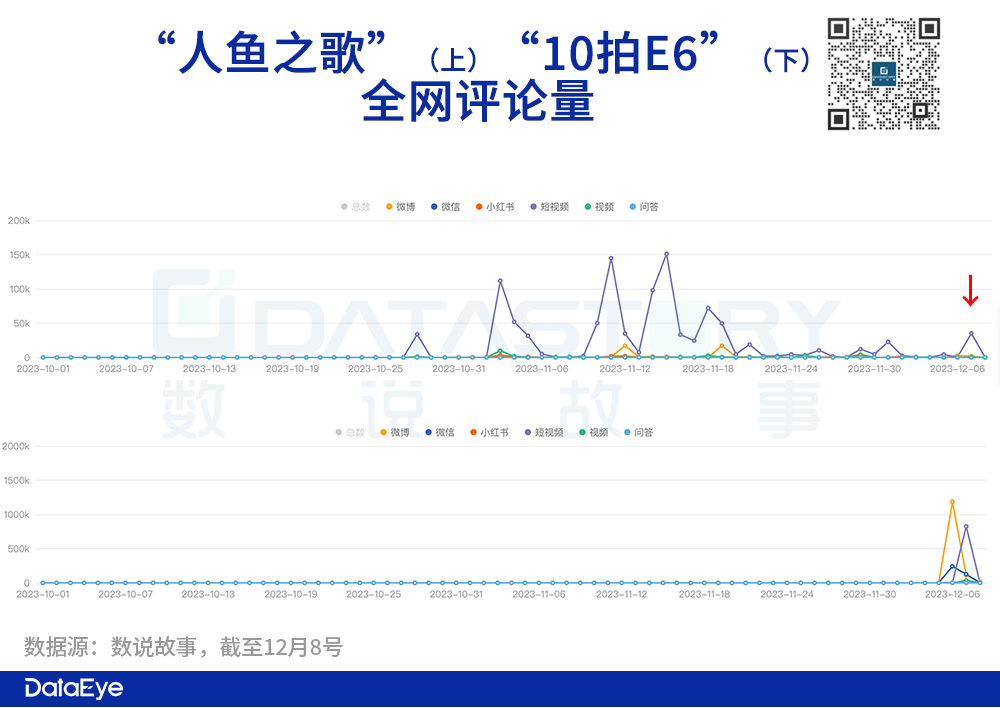 同期,“10拍E6”全网总互动量255.5万。其中评论量数据方面,12月6、7日接连两次出现高峰。从微博微信火到短视频。