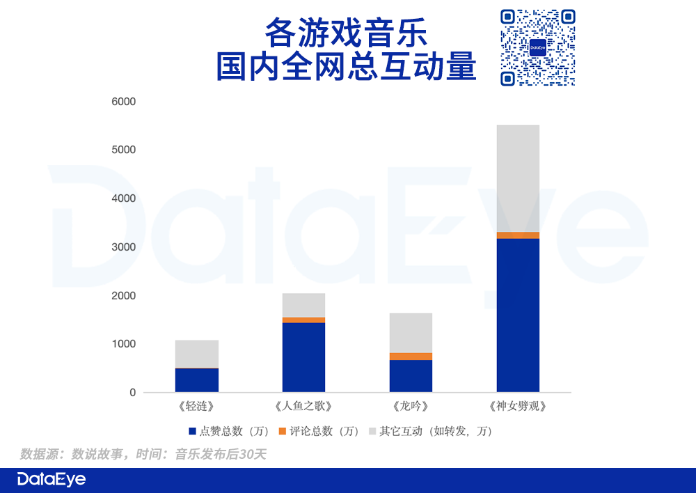 作为游戏+音乐的巅峰和标杆,《神女劈观》2022年1月5日发布,发布后30天国内全网总互动量5234.5万。具体互动量构成如下: