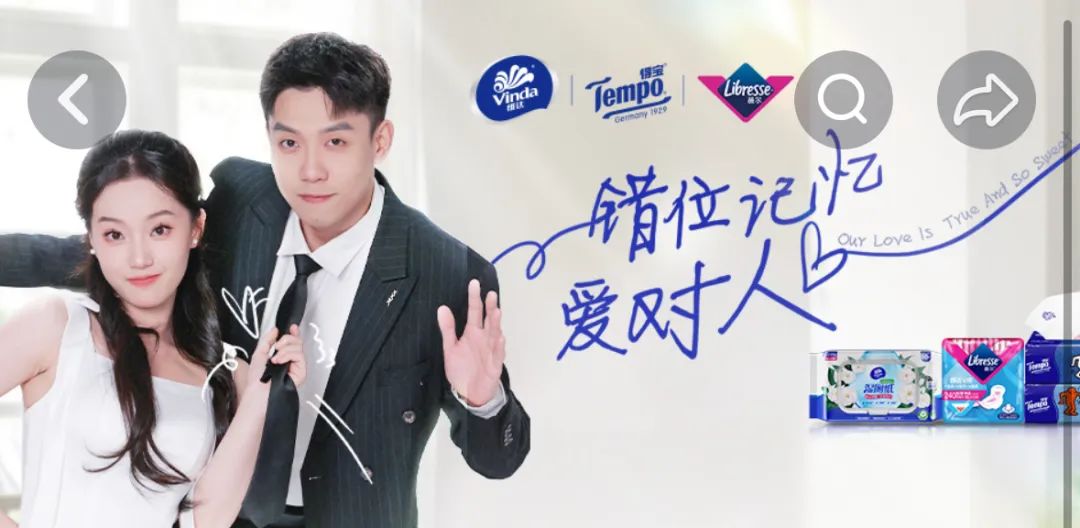 首先,植入短剧可单集投放、可全剧投放。单集植入优点是成本极低,但曝光并不低(短剧时长短,产品露出比例就更大)。比如抖音播放破1.2亿的《错位记忆爱对人》就先后吸引到维达、得宝、薇尔进行单集投放,但诸如在饭桌上摆放“维达纸巾”、“得宝抽纸”这种与场景极相配产品,对观众是有不错“带货”效果的。