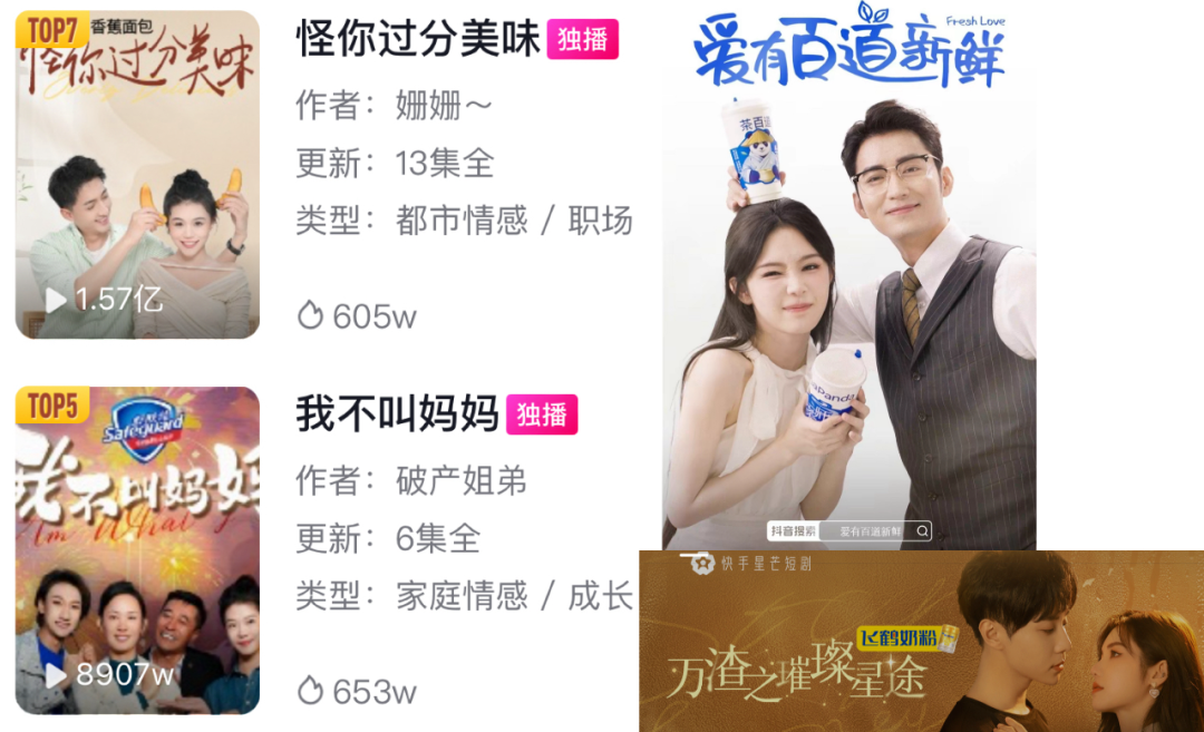 投放全剧则是目前行业更主流做法,一来,它的好处是,通过植入全剧加冠名的方式,品牌可内嵌于短剧在剧内场景、剧外话题页、短视频封面等平台站内多维曝光,短剧与品牌几乎是“绑定”式地植入了用户心智。