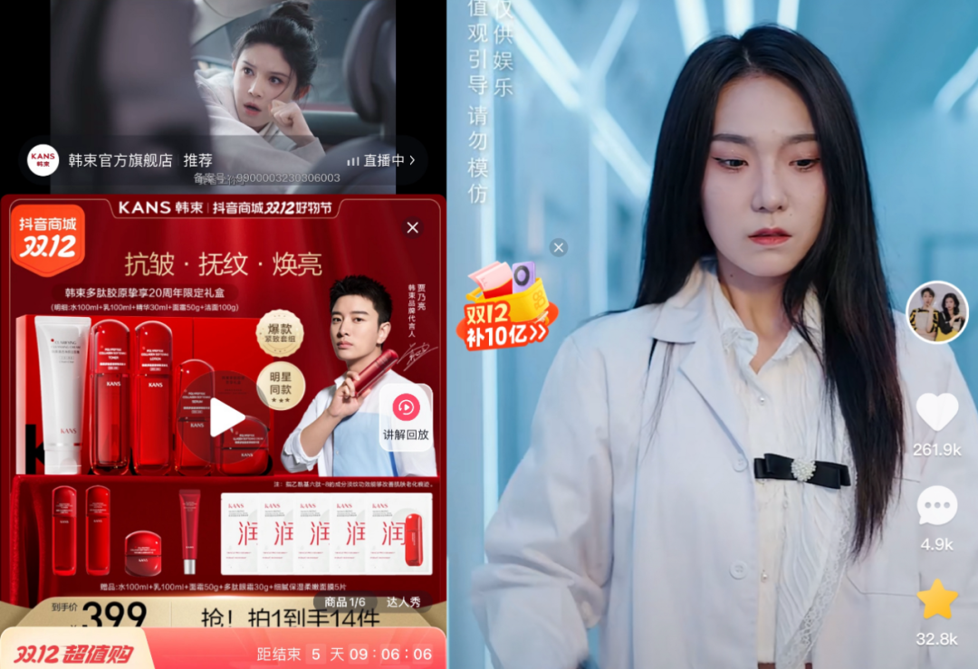 二来,因为短剧往往以“竖屏”格式播放,用户在刷短视频看剧之余,界面上就留有充足空间给品牌借题发挥。像韩束在《以成长来装束》播放页左下角挂载韩束商品页跳转小车、天猫国际冠名的《美颜成真》在剧集页左侧内嵌“双12补10亿”促销信息,这都是助力品牌借剧传播、实现转化的高级带货技巧。
