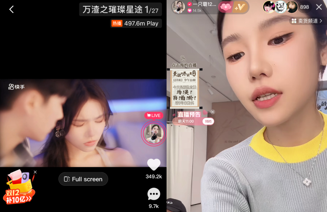 因此,如果品牌短剧找这些达人合作,就可以将品牌传播从剧集营销延伸至达人营销。比如快手短剧《万渣之璀璨星途》找了平台粉丝达700万+的“一只璐”担当女主角,短剧热播同期就顺势发动账号一只璐做直播带货,拉动了该剧冠名飞鹤奶粉商品在带货链路上的高效转化。