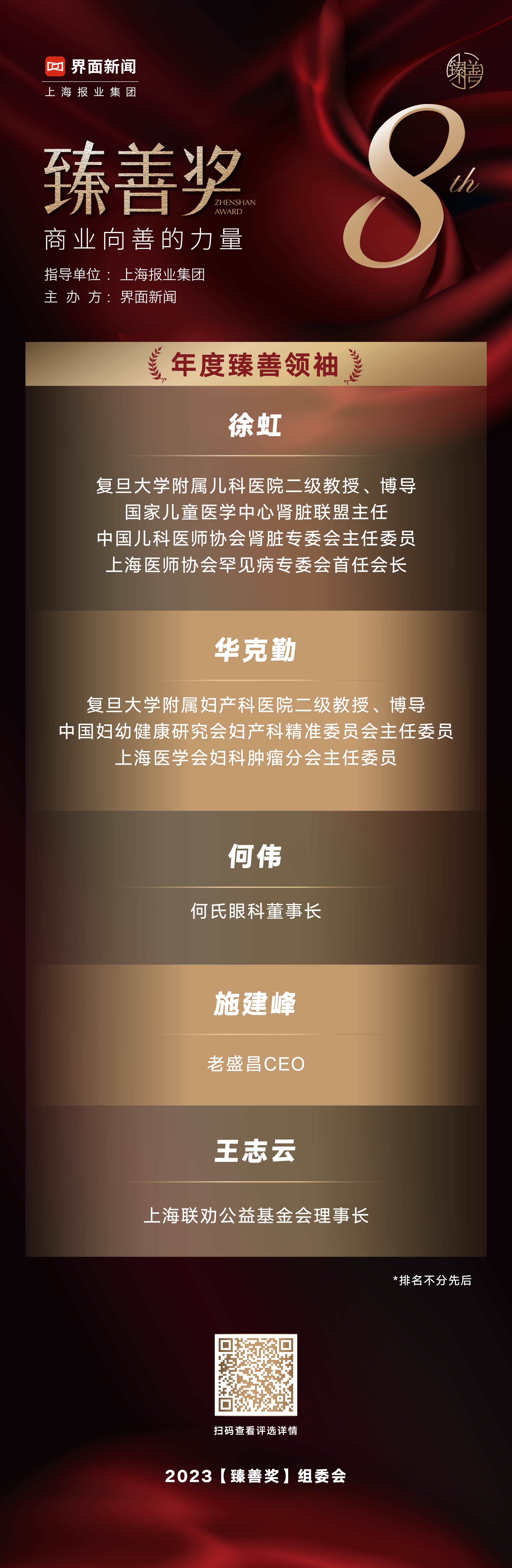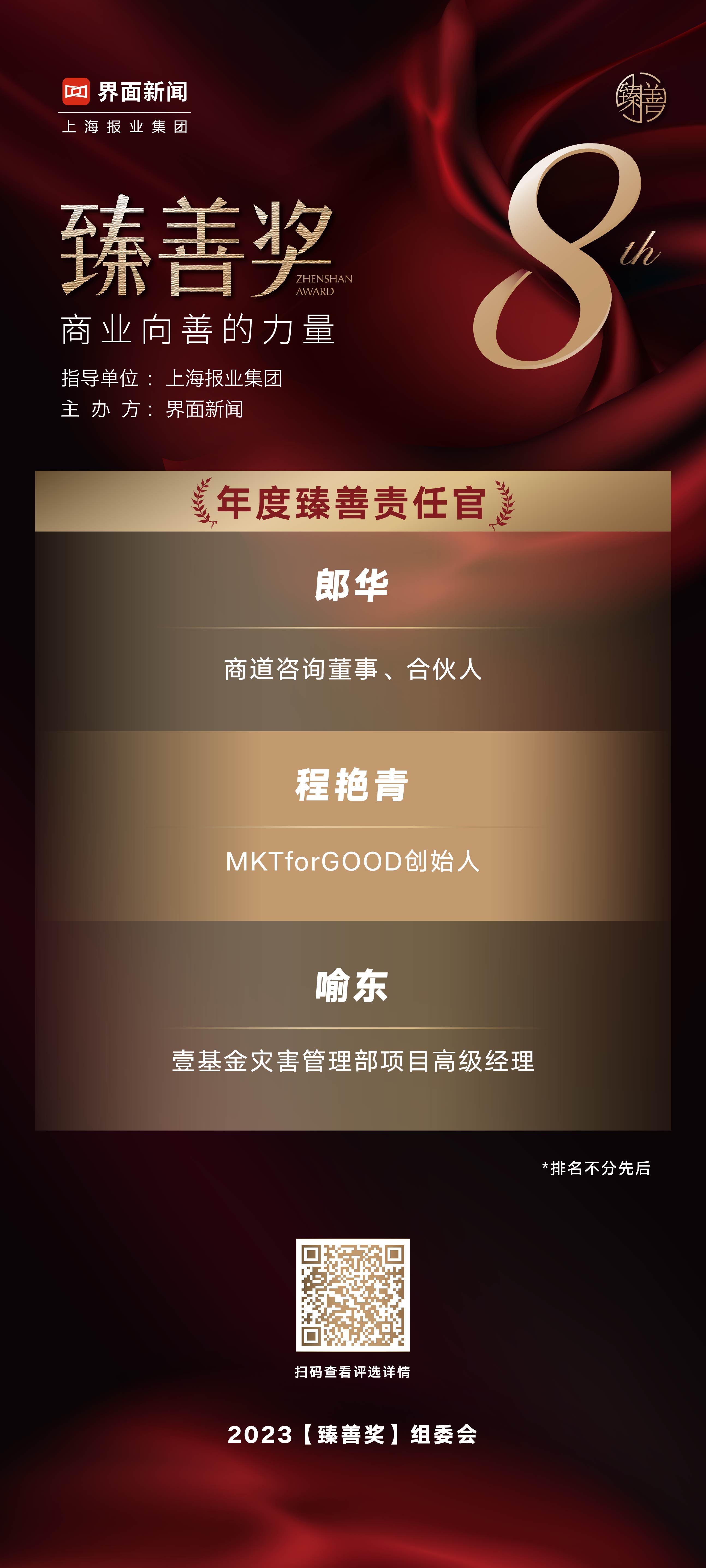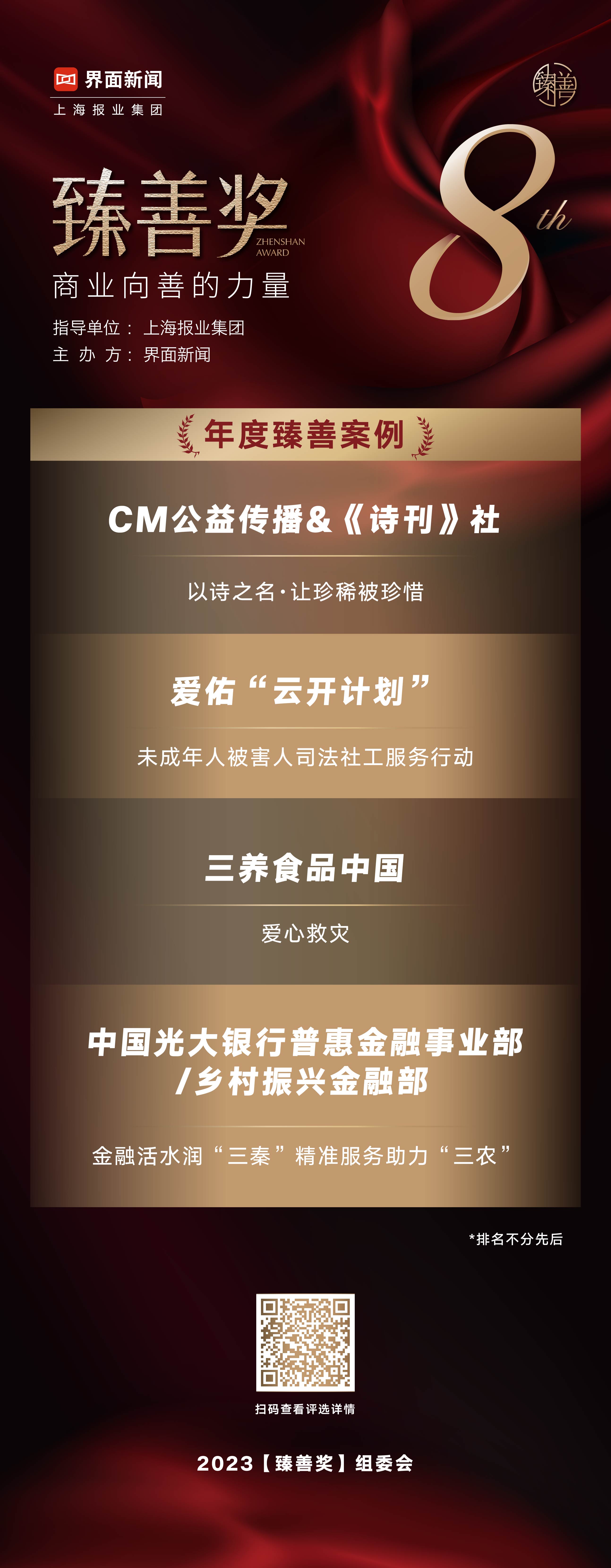 由上海报业集团|界面新闻主办的【臻善奖】始终以企业社会责任为核心,7年来持续挖掘商业向善的代表性企业、案例、人物,鼓励企业以商业模式解决社会问题。今年,2023【臻善奖】评选再度启动,旨在凝聚社会各界向善力量,共同关注社会议题,同时表彰并致敬积极践行社会责任及公益慈善精神的企业、人物,共探向善方法论,共创美好生活。