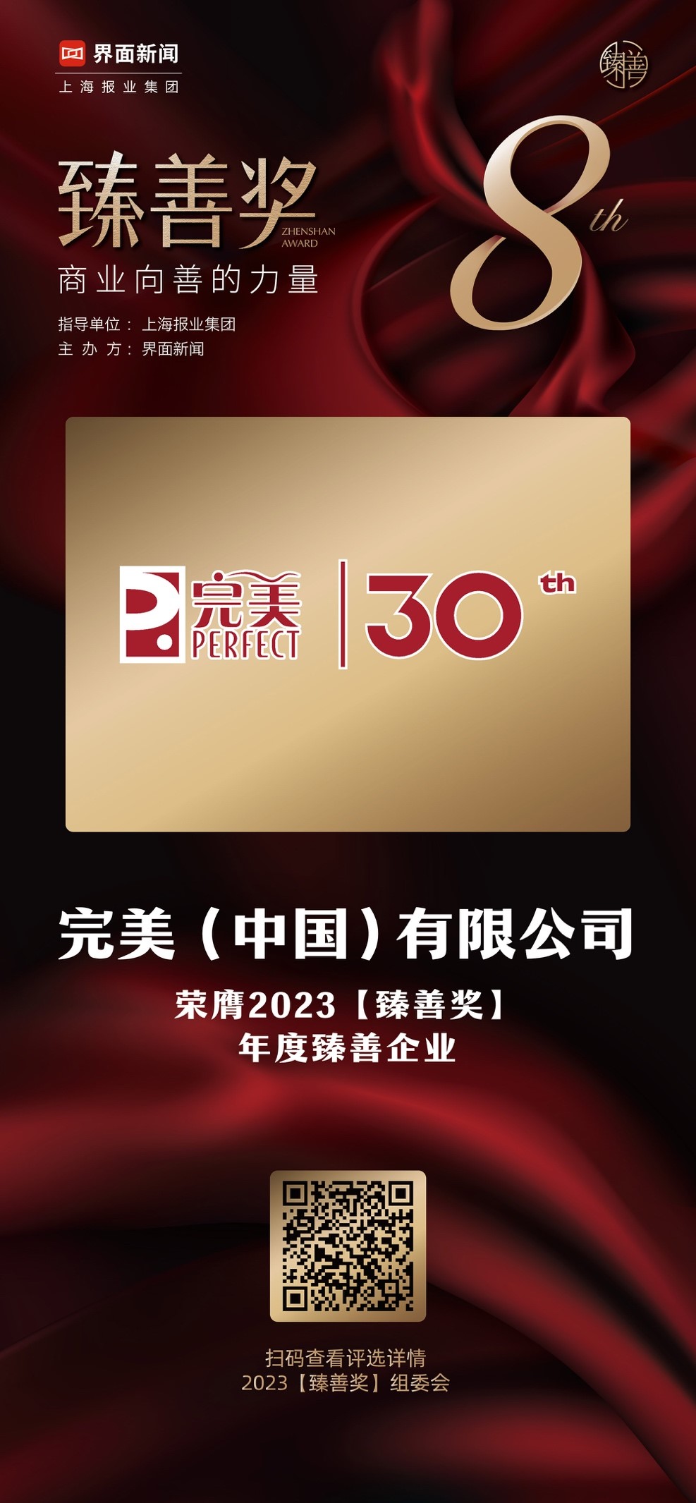 12月13日,上海报业集团 | 界面新闻在上海中心举办了2023【臻善奖】颁奖典礼,并正式公布了本年度获奖名单。聚“商业向善”之力,本届【臻善奖】吸引了一大批在公益慈善领域有所贡献的优秀企业和公益人士参与。完美(中国)有限公司积极践行社会责任,推动社会高质量发展,荣膺年度臻善企业。
