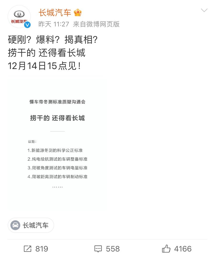12月11日上午11点许,长城汽车官博发文:《捞干的,还得看长城》副标题是:懂车帝冬测标准质疑沟通会。