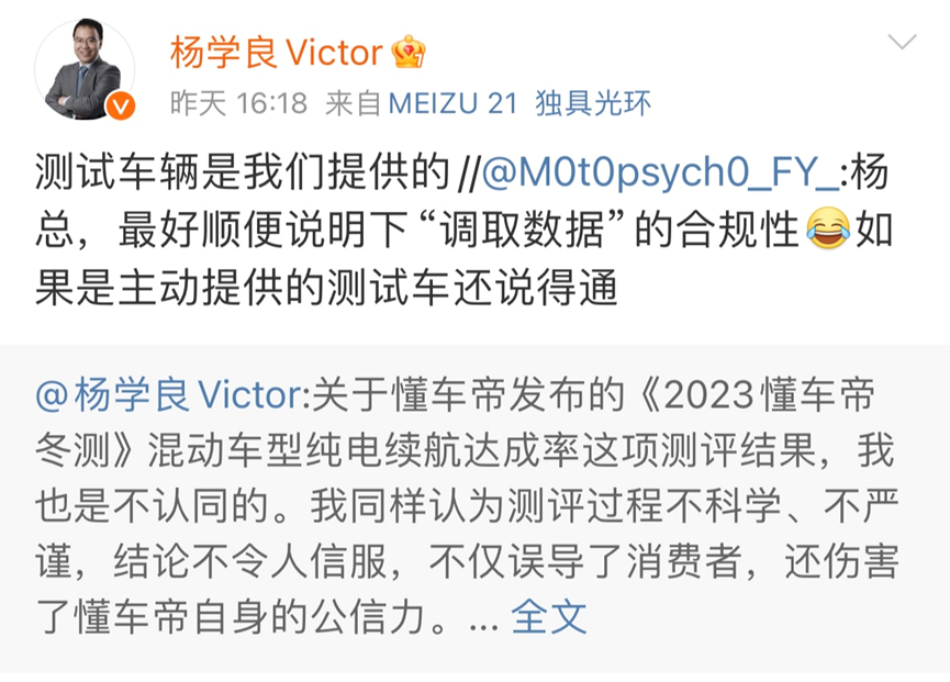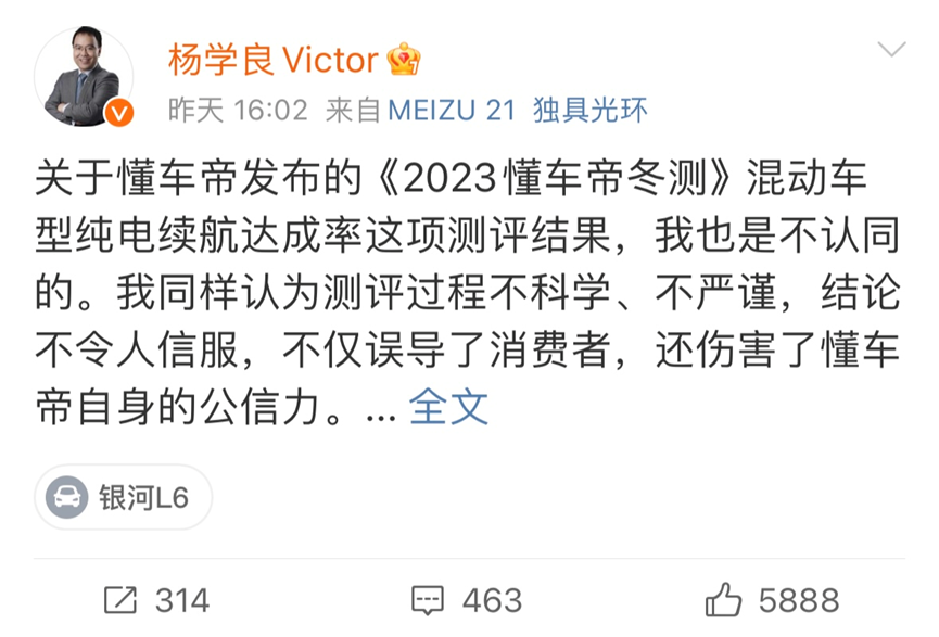 很快,当天下午4点多,吉利控股集团高级副总裁杨学良发微博:对这个测评结果,我也是不认同的。测评过程不科学、不严谨,结论不令人信服,不仅误导了消费者,还伤害了懂车帝自身的公信力。