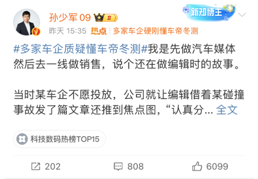 微博博主孙少军表示:他做编辑时,某车企不愿意投放合作,公司就把该车企碰撞事故推到焦点图,分析了该车如何不安全。不到十分钟,对方主动请求合作,于是公司撤下原稿,开始夸这车竞争力如何强。