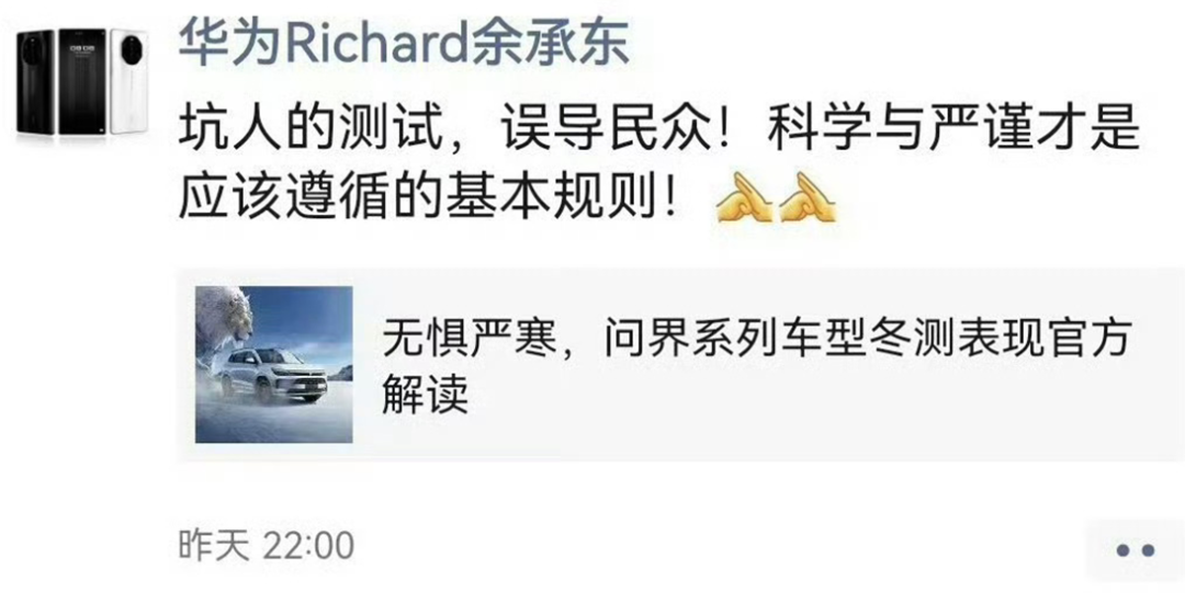 华为智能汽车解决方案BU董事长余承东,率先在朋友圈发声:“坑人的测试,误导民众!科学严谨才是应该遵循的基本规则!”