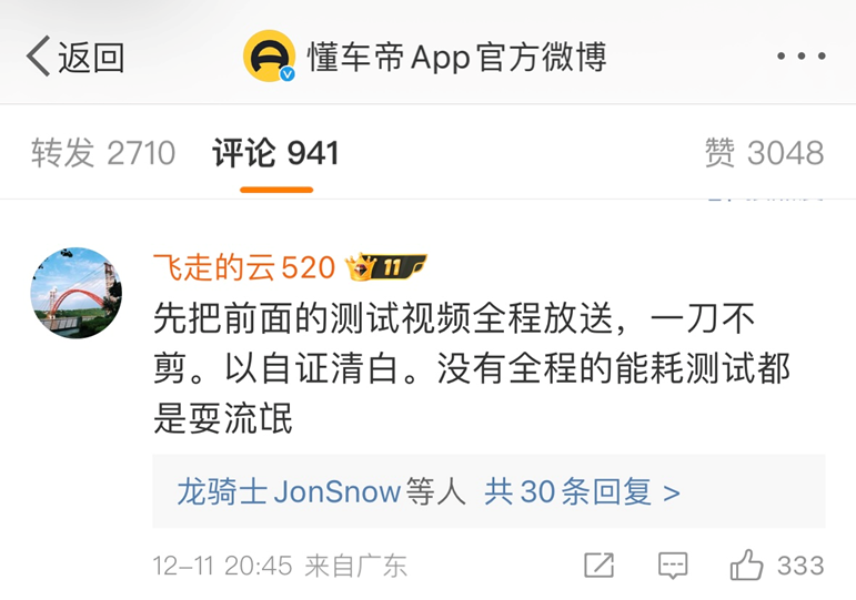 果然,网友也持类似观点。一个获赞最高的评论是:“先把前面的测试视频全程放送,一刀不剪,以自证清白。没有全程的能耗测试,都是耍流氓。”