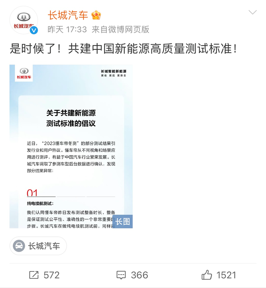 接着,12月11日下午5时许,长城汽车再发微博:关于共建新能源测试标准的倡议。共有3条质疑和建议: