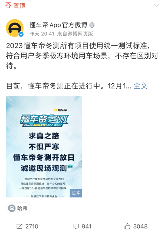 同时,懂车帝还公开邀请39家车企于12月14日参加漠河进行的新能源车极寒测试。文案的标题是:求真之路,不惧严寒。