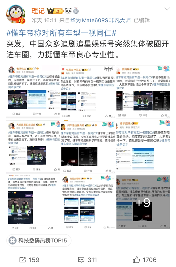 配图是18张截图,显示一些娱乐博主纷纷发声力挺懂车帝,带的话题也是统一的#懂车帝称对所有车型一视同仁#、#懂车帝回应测试争议#,不少还是金V。