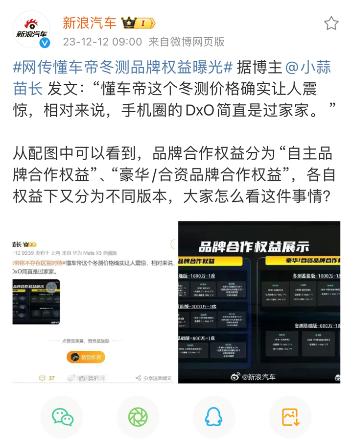 事件的高潮是,12月12日9点,新浪汽车发微博,引用一位博主的信息:“懂车帝这个冬测价格确实让人震惊,相对来说,手机圈的DxO简直是过家家。”