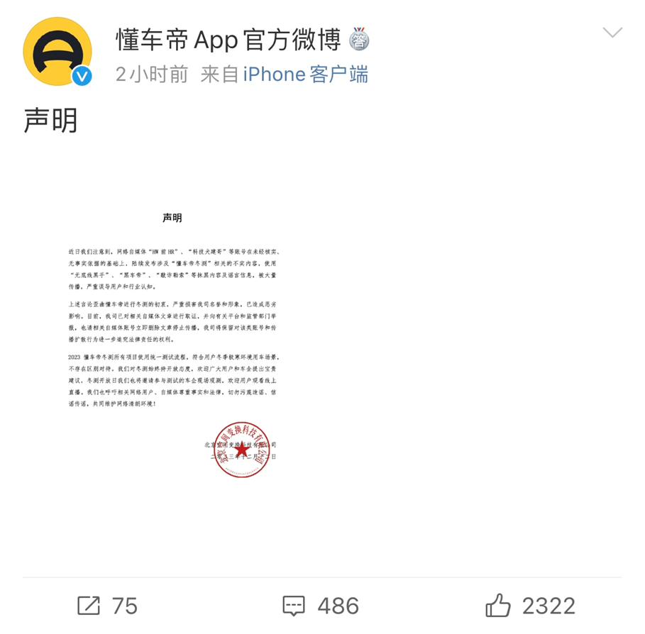 当晚8时许,懂车帝发布微博:冬测所有项目使用统一标准,符合用户用车场景,不存在区别对待。