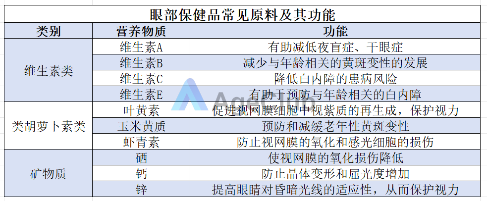 维生素、类胡萝卜素、矿物质和花青素是眼部保健产品的最常见原料。