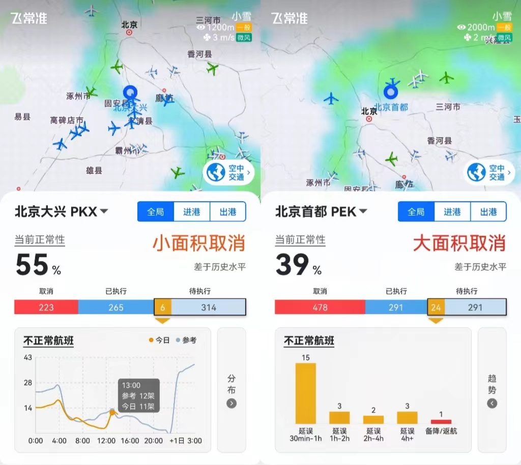 航班方面,受强降雪影响,大量航班取消。飞常准APP显示,截至发稿,北京首都机场大面积取消,已取消航班478架次;北京大兴国际机场小面积取消,已取消航班223架次。