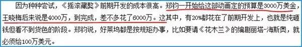 《摇滚藏獒》制作方野心很大,准备卖全球市场,请的好莱坞班底,所以做完成本达到6000万美元。这在好莱坞也就是中等制作(像《疯狂动物城》这样的动画预算基本都在1.5亿美元左右),但跟国内的动画片一比就是高到离谱。