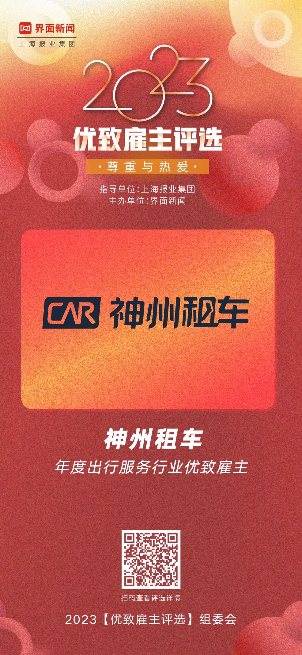 12月13日,上海报业集团l界面新闻在上海中心举办了2023【优致雇主评选】颁奖典礼,隆重公布本年度上榜企业。围绕寻找和评选最佳雇主这一责任旨归,以独立客观立场,通过专业科学的调查和评估体系,洞察求职者的需求变化,同时为求职者发现“好雇主”提供有效参考,实现雇主与雇员的“双赢”,各行各业的优秀企业均踊跃参加。神州租车凭借创新的企业文化和管理模式以及可持续发展理念,荣膺2023【优致雇主评选】年度出行服务行业优致雇主。