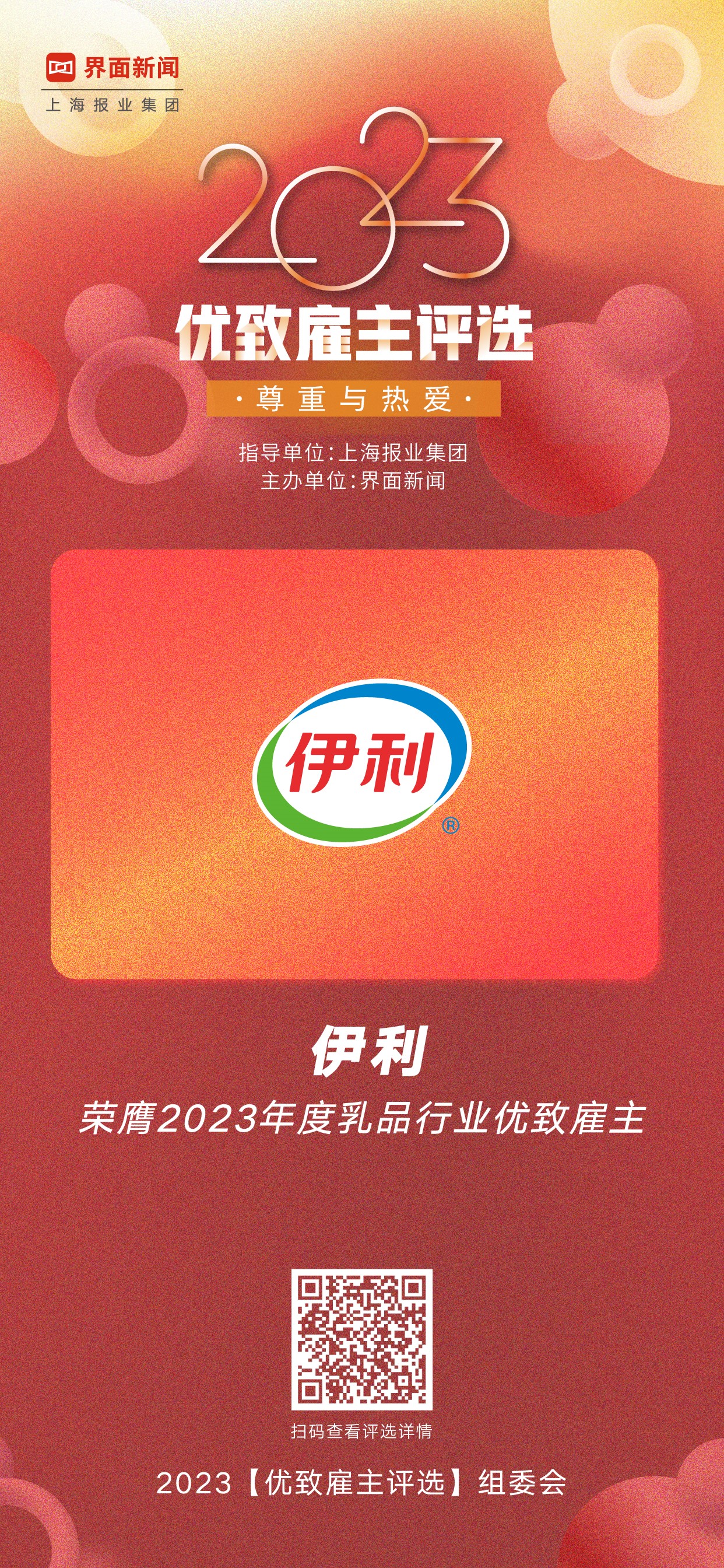 12月13日,上海报业集团l界面新闻在上海中心举办了2023【优致雇主评选】颁奖典礼,隆重公布本年度上榜企业。围绕寻找和评选最佳雇主这一责任旨归,以独立客观立场,通过专业科学的调查和评估体系,洞察求职者的需求变化,同时为求职者发现“好雇主”提供有效参考,实现雇主与雇员的“双赢”,各行各业的优秀企业均踊跃参加。伊利凭借创新的企业文化和管理模式以及可持续发展理念,荣膺2023【优致雇主评选】年度乳品行业优致雇主。