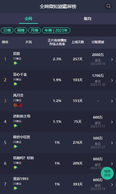 新的分账规则之下,腾讯在分账剧市场确实取得了不错的成绩,如果按照剧集体量把分账剧分为微短剧赛道和中长剧赛道,腾讯在2023年可以说是称霸微短剧赛道。